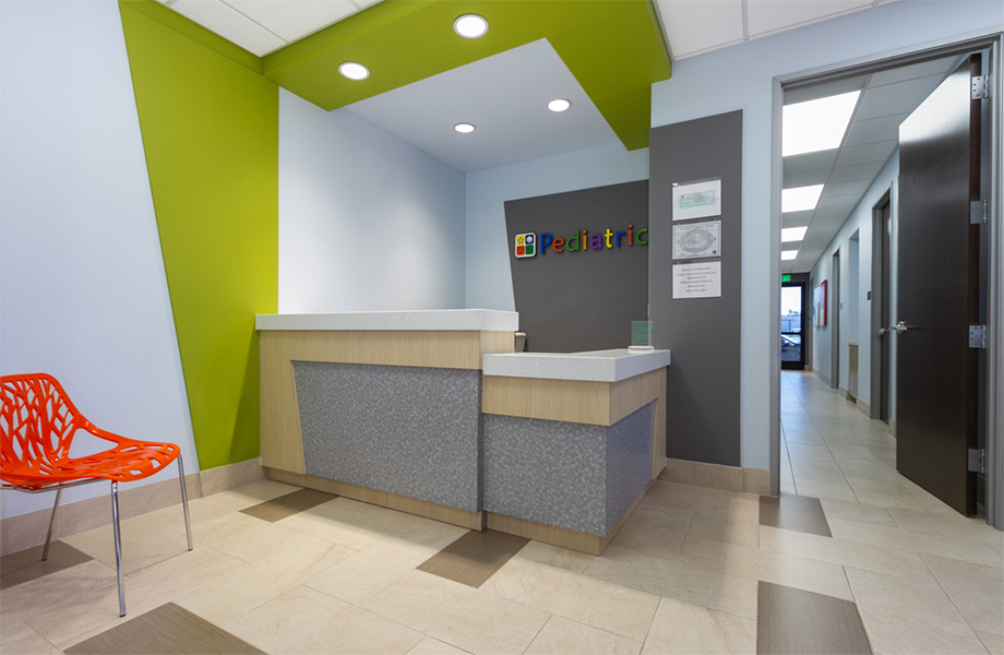 Mayflower Pediatrics went outside the SurfaceSet range to feature Folkstone Hex along with Natural Ash on the reception desk. These two laminates pair nicely with the pops of bold color that is symbolic of a child-friendly environment.