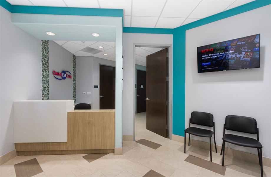 And finally, Omni Eye Care maintains the cohesive look with the Natural Ash reception desk and Cascara Teakwood door.