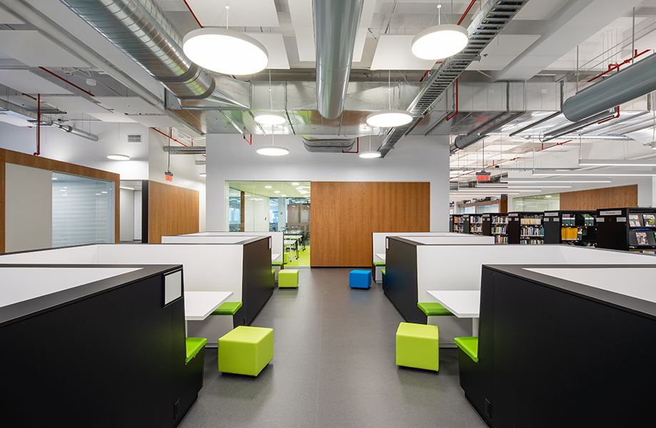 The design put forth by CGA Architects Inc., called for the outdoors to be visible from anywhere within the library. The natural lighting, paired with exposed ductwork, has really helped bring a modern look and feel to the library.