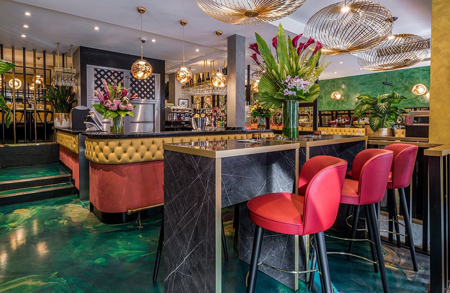 Skræddersyede borde med Formica® laminat i klassisk Calacatta-marmor og Ferro Grafite Satin-marmor, som er afsluttet med guldaluminiumsdetaljer, hvilket skaber et slankt, stilfuldt og holdbart møbeldesign. De nedtonede farvevalg gør det muligt for de vibrante farver, der bruges andre steder i projektet, virkelig at skille sig ud.