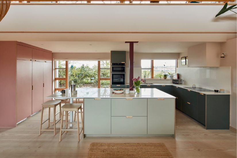 A sliding wall offers the choice between either divided spaces or a combination of the living spaces, depending on the activity. A recognisable colour was chosen for each living group. This hue was further split tone by tone into three undertones.