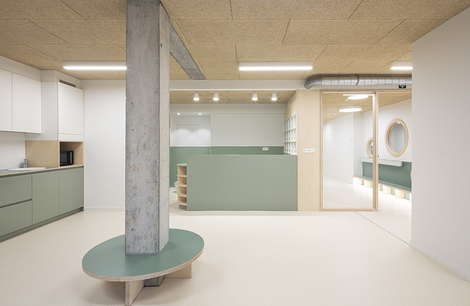 «Stedet var opprinnelig planlagt til å bli to leiligheter, så utfordringen var å konvertere den tilgjengelige plassen til en barnehage. Vi lette etter en myk fargepalett i kombinasjon med det hjemmekoselige bjørketreet. Avrundede former, tone-til-tone-farger og lekne elementer danner grunnlaget for dette designet. Tone-til-tone-effekten kunne vi bare oppnå med Formica® Collection støttet av Homapal».