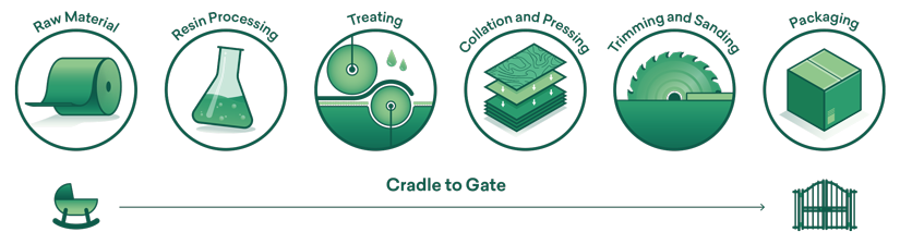 We use the cradle-to-gate scope for our on-site Life Cycle Assessments (LCAs), because we focus on the stages that are under our control and that we can influence. We are able to improve our processes to make them more efficient and we are continuously working towards using less impactful raw materials. Moreover, for the lifecycle stages that are after our factory gate, we currently don’t have enough data which requires us to make additional assumptions in terms of the disposal of our laminate sheets. Lastly, we are currently waiting on upcoming regulations and a general consensus on the topic of carbon storage benefits of long-lasting products at the end of their lifetime.